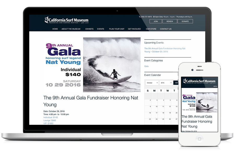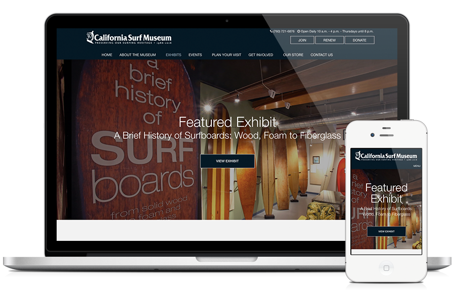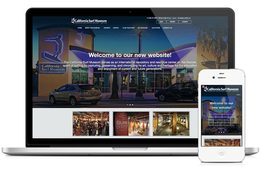 The CA Surf Museum is your one-stop-shop for all things relating to the history of surfing and the lifestyle behind the sport. Although they have a great presence in Oceanside, CA, they needed to increase their exposure online. With SDA’s help, we were able to produce for them a new look, organize their content more efficiently while providing their visitors an easier way to locate the information they need. CA Surf Museum’s site is a custom WordPress theme built with responsive functionality, events, blog and e-commerce.